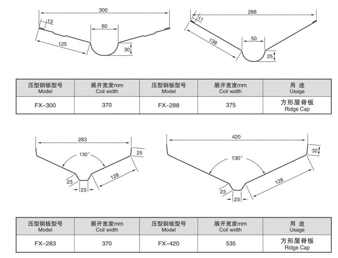 本公司可以根據(jù)不同尺寸的屋脊瓦設(shè)計(jì)屋脊瓦成型機(jī)。我們公司的設(shè)備采用滾輪成型技術(shù),配合液壓剪切設(shè)備,可以生產(chǎn)出邊緣平整,形狀美觀的屋脊瓦。