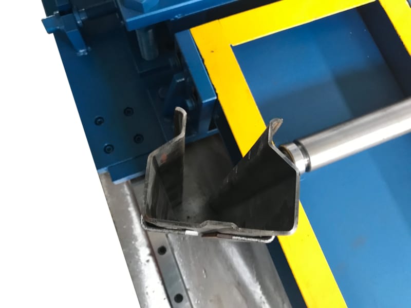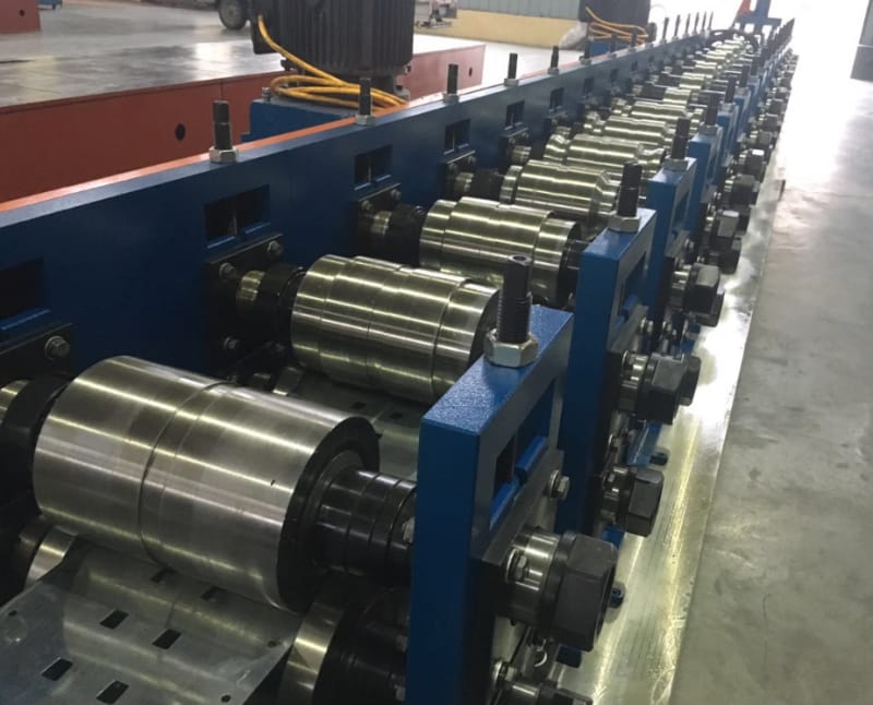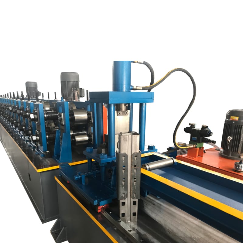 在生產(chǎn)過程中,對孔和槽進(jìn)行沖壓,以便將負(fù)載梁安裝到立式機架中。該套貨架立柱系統(tǒng)設(shè)備包含整套立柱生產(chǎn)線,包括開卷機、液壓沖孔機、貨架立柱成型機、收料臺等部分,可以通過參數(shù)設(shè)置,生產(chǎn)不同尺寸的貨架立柱。